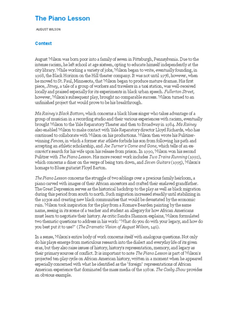 . August Wilson -- Critical Essay Example. To those who have found this material useful please make an effort to let at least two people know about my web site so that we can start a chain reaction of ever more people that. The Piano Lesson Pdf Download.